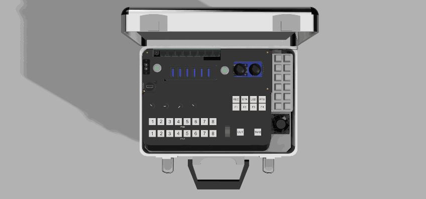 Устройство позволяет вести выездную многомерную съемку, включает в себя рабочие места режиссера и оператора: пульт видеомикшера и клавиатуру с джойстиком для управления IP PTZ камерами. Поддерживает видеокодеры, HDMI, VGA. Камеры подключаются